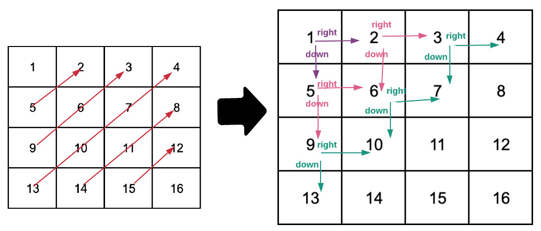 Zig-Zag Traversal: 1 5 2 9 6 3 13 10 7 4 14 11 8 15 12 16