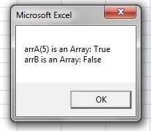 Function FnIsArray() Dim arrA(5) Dim arrB Dim strResult strResult = "arrA(5) is an Array: " & IsArray(arrA) & vbCrLf strResult = strResult & "arrB is an Array: " & IsArray(arrB) MsgBox strResult End Function