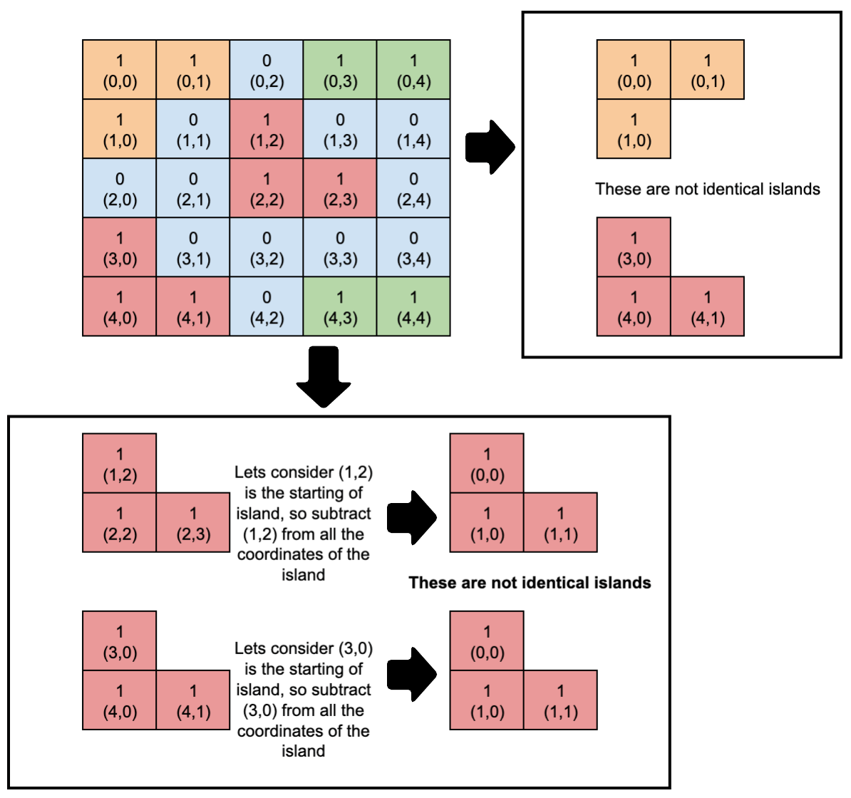 How to determine if two islands are identical: If coordinates in two islands form an identical shape or structure. The coordinates of both the islands can be at a different location. See the example below